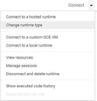 On the top right corner of the page, click the drop-down arrow to the right of the Connect button and select Change runtime type.