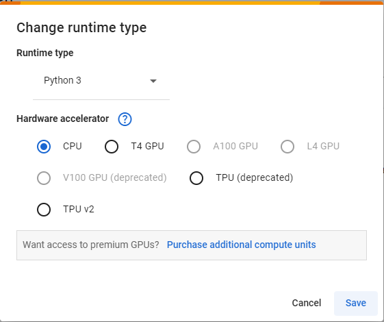 Make sure Python 3 runtime is selected. For this part of the workshop CPU acceleration is enough.